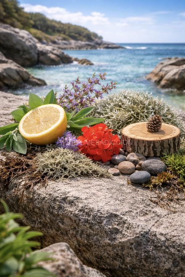 Frescura marina mineral con limón luminoso y fondo amaderado limpio… brisa oceánica pura y elegante.