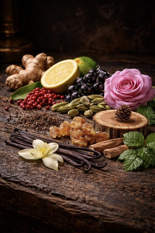 En el corazón, el cardamomo y las grosellas negras crean un contraste especiado-frutal elegante, acompañado por la rosa turca que aporta un matiz floral refinado, nunca dominante. Es un corazón complejo, equilibrado y muy bien construido.