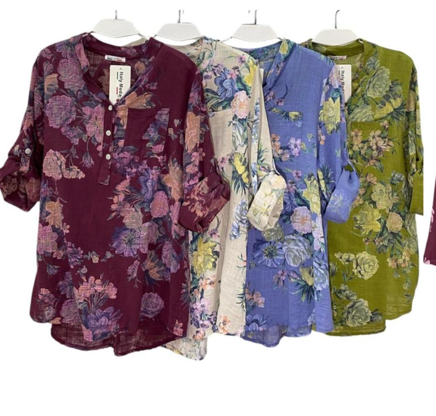 Blusa de manga 3/4 con bolsillo estampado con flores, de lino ITALIANO