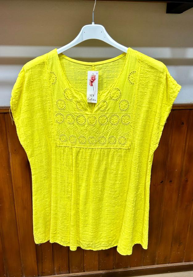 Blusa escote en V con estampas de broderie, de lino ITALIANO