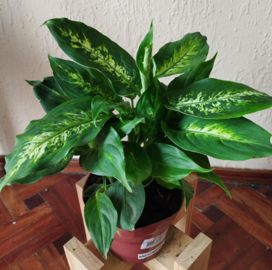 La Dieffenbachia compacta es una planta tropical perenne de interior de crecimiento más reducido, con hojas grandes, lanceoladas, de color verde oscuro con distintivas manchas o vetas de color blanco cremoso. A diferencia de otras Dieffenbachias, su tamaño es más limitado, alcanzando una altura menor, lo que la hace ideal para espacios pequeños