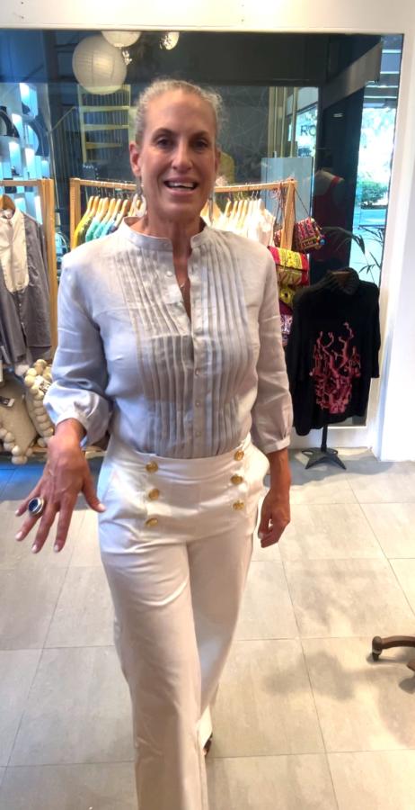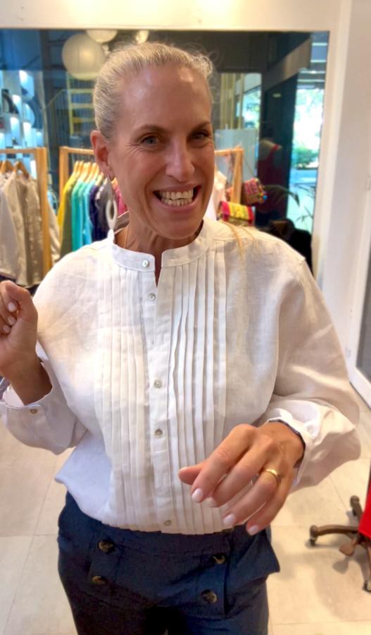 La natural tiene el interior del cuello y puños en contraste en lino/algodón a rayas azul y blanco.
