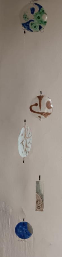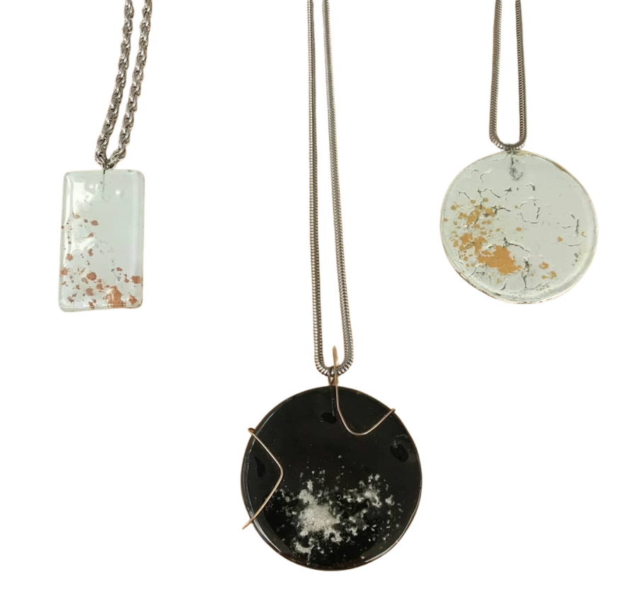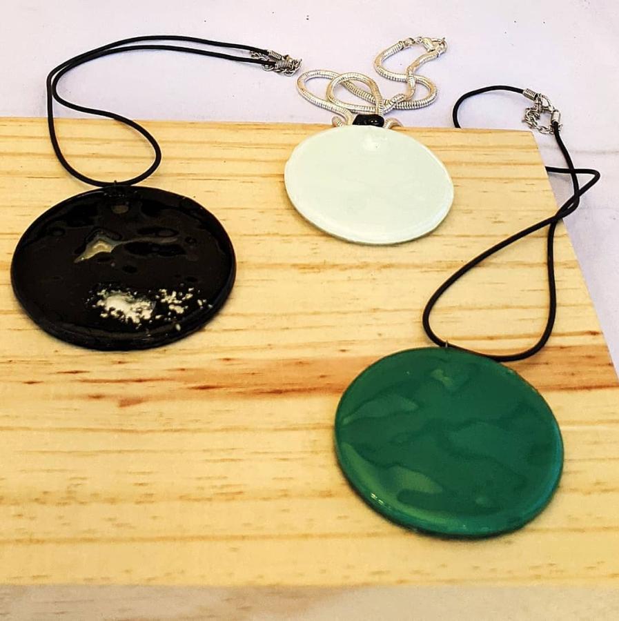 Mi horno es pequeño así que opté por la realización de accesorios como colgantes, caravanas, pulseras y algo de decoración de ambientes con colgantes verticales. El vidrio me da la posibilidad de imaginar y concretar diferentes proyectos en los que juego con el color, la transparencia, la luz, el brillo, diferentes texturas y formas. Además de poder combinarlo con otros materiales como el metal, en mi caso la alpaca pero combinaperfectamente con cobre, bronce, aluminio y plata. Tambien con textiles y madera y por supuesto cerámica.