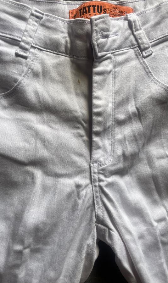 Jean blanco modelo chupin, confeccionado en tela Jean con lycra, cómodo y de calce ajustado. DETALLES A LA VISTA (pequeñas manchas)