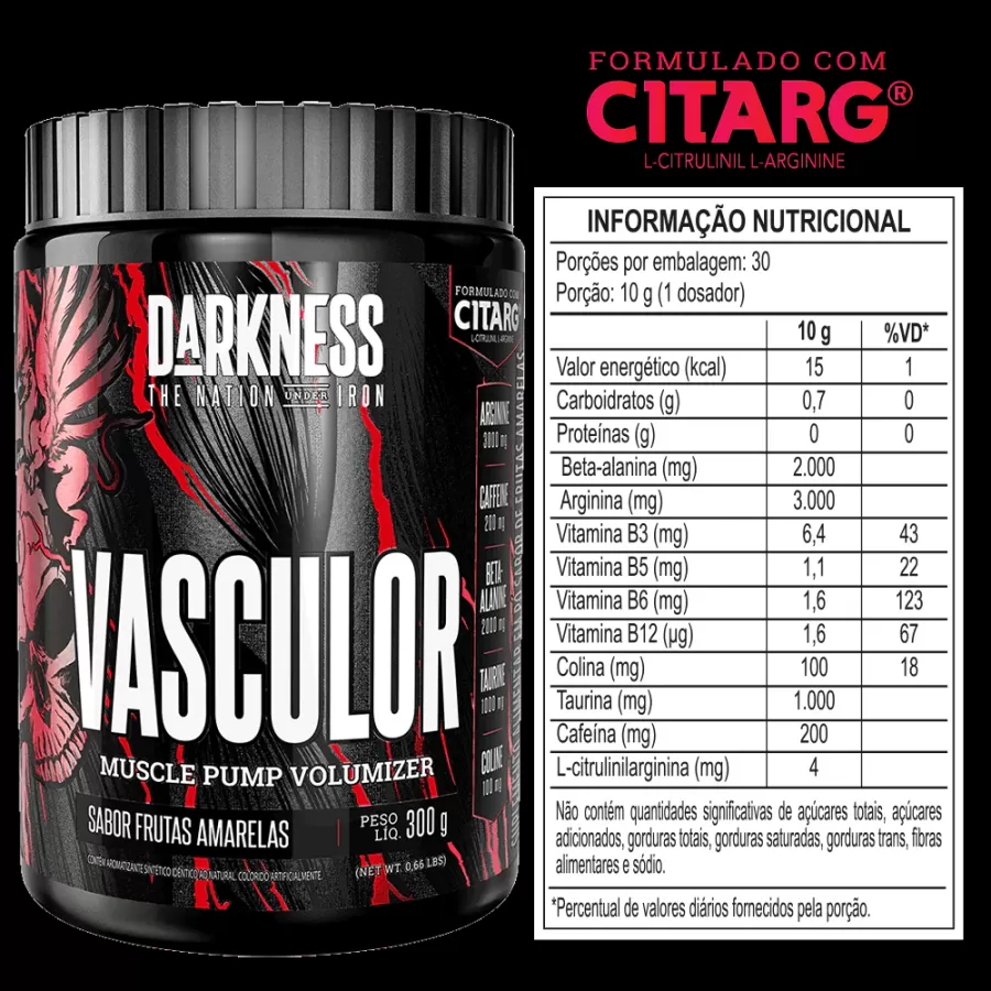 Formulado por Darkness, línea reconocida por sus productos extremos y orientados a la performance, Vasculor está pensado para entrenamientos fuertes, pesados y exigentes.