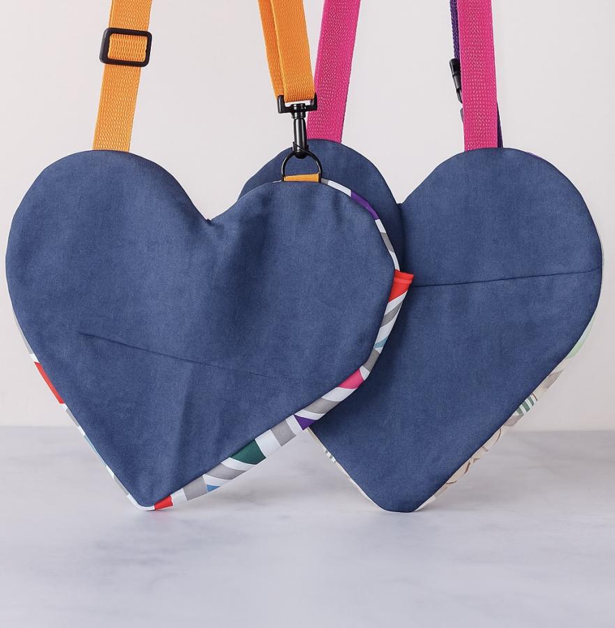 Tote bag con forma de corazón, práctica, liviana, cómoda para transportar. En jean fino y lona, asas de tira mochilera.