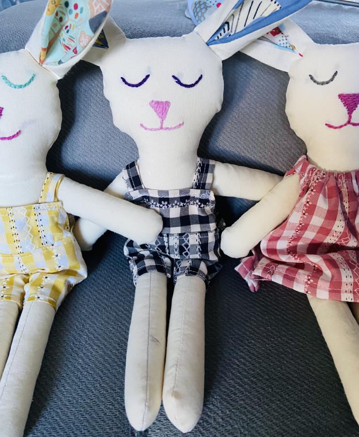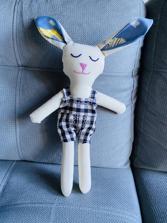 Muñeco de tela, confeccionado en lienzo, carita bordada y enterito negro. Hermoso conejo 🐇 ideal para los más chiquitos/as.