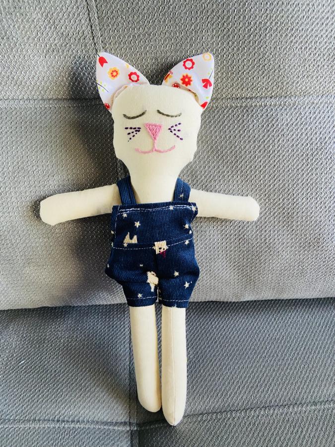 Orión es un gatito pequeño que vino a jugar y alegrar tus días. Hecho en lienzo, bordado a mano y vestido con mucha onda. Mide 30 cm de alto aproximadamente