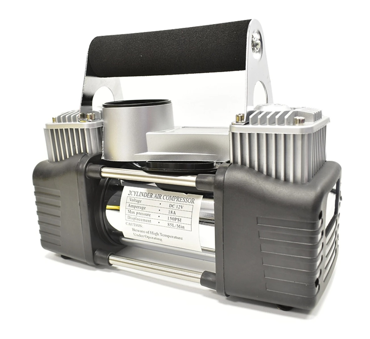 Compresor bicilindrico Potencia: 12VPresión máxima 150 psi/lbCaudal 85L/MinutoIncluye:Bolso de transporteDos adaptadoresManometroManguera de largo alcance