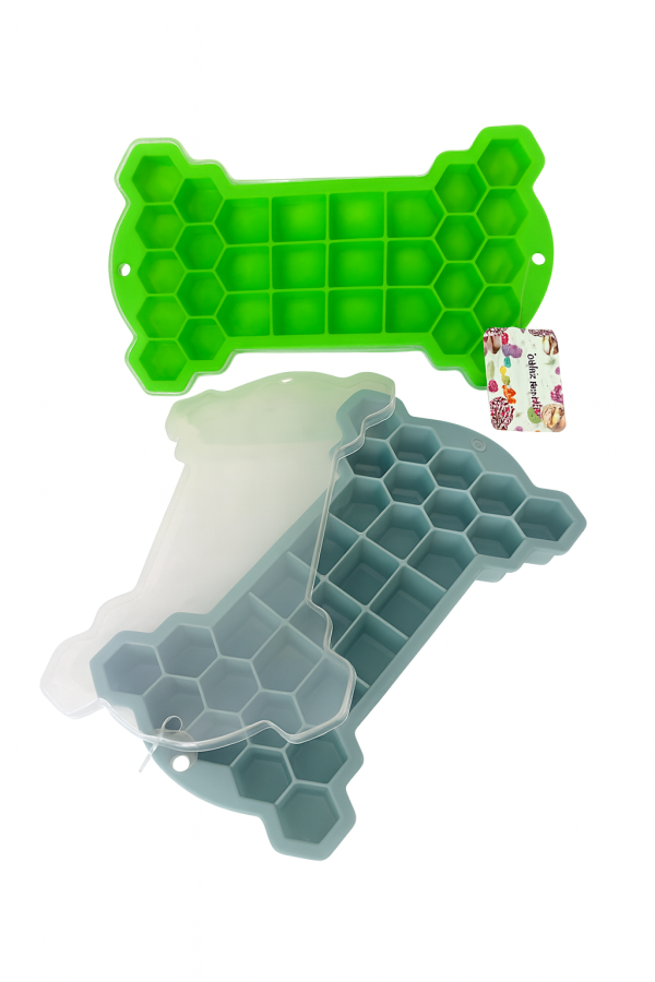 Molde de silicona flexible con forma de panal, ideal para hacer cubos de hielo fácilmente. Incluye tapa plástica para evitar derrames y olores en el freezer. Disponible en varios colores y resistentes al frío extremo.