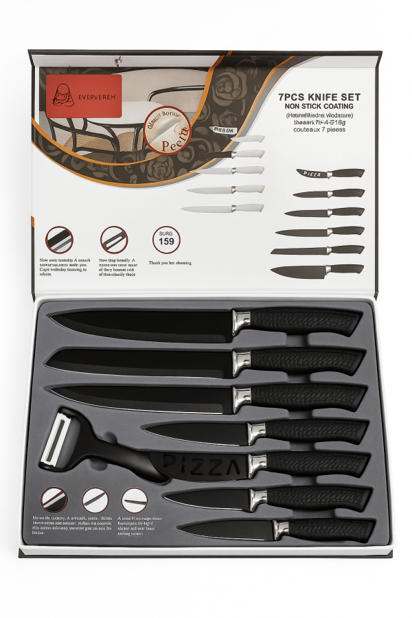 Set completo de cuchillos con revestimiento antiadherente, mango antideslizante y hoja afilada para todo tipo de cortes. Incluye pelador de regalo. Ideal para tu cocina o como regalo práctico y elegante.