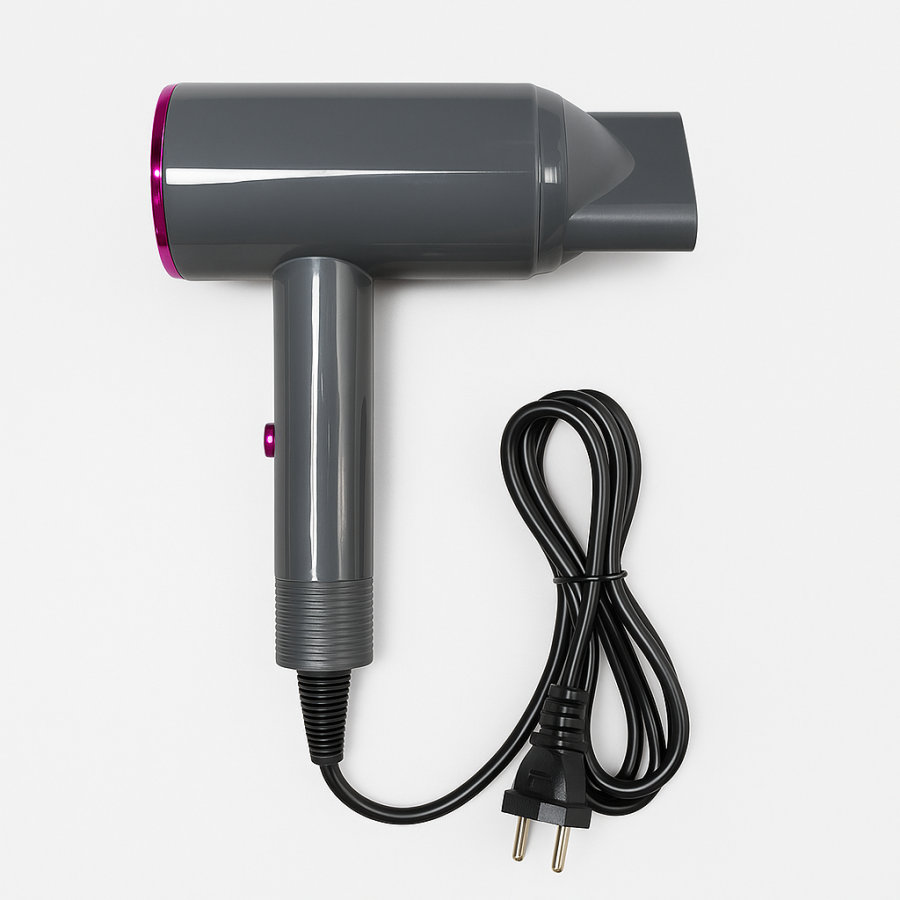 Secador de pelo moderno con diseño liviano y ergonómico. Ideal para uso diario, ofrece dos niveles de velocidad y potencia para un secado rápido y eficiente sin dañar el cabello. Su tamaño compacto lo hace perfecto para viajes o el hogar.