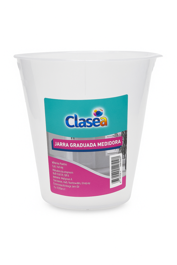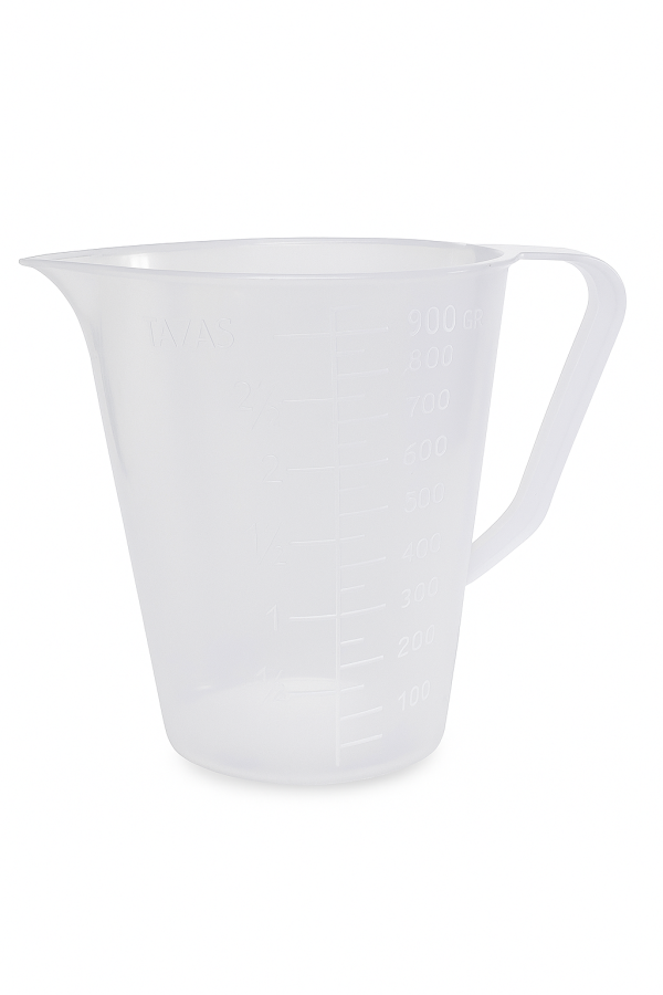Jarra graduada de 900 ml fabricada en plástico resistente y translúcido, ideal para medir líquidos o ingredientes con precisión. Incluye marcas visibles en mililitros, gramos y tazas.