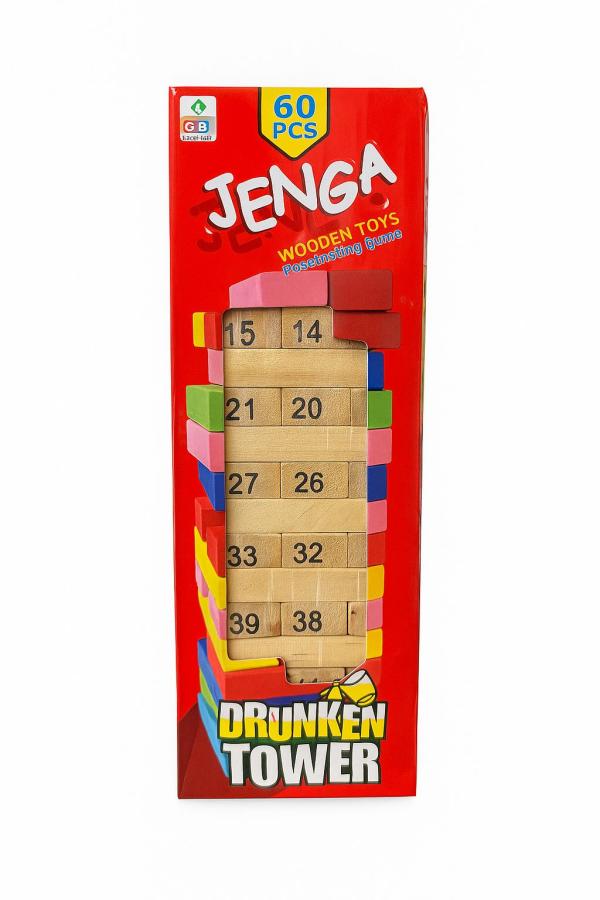 Divertite con el clásico juego de destreza Jenga Drunken Tower, ideal para reuniones, fiestas o tardes en familia. Contiene 60 bloques de madera numerados y de colores.