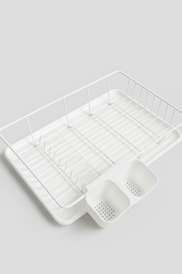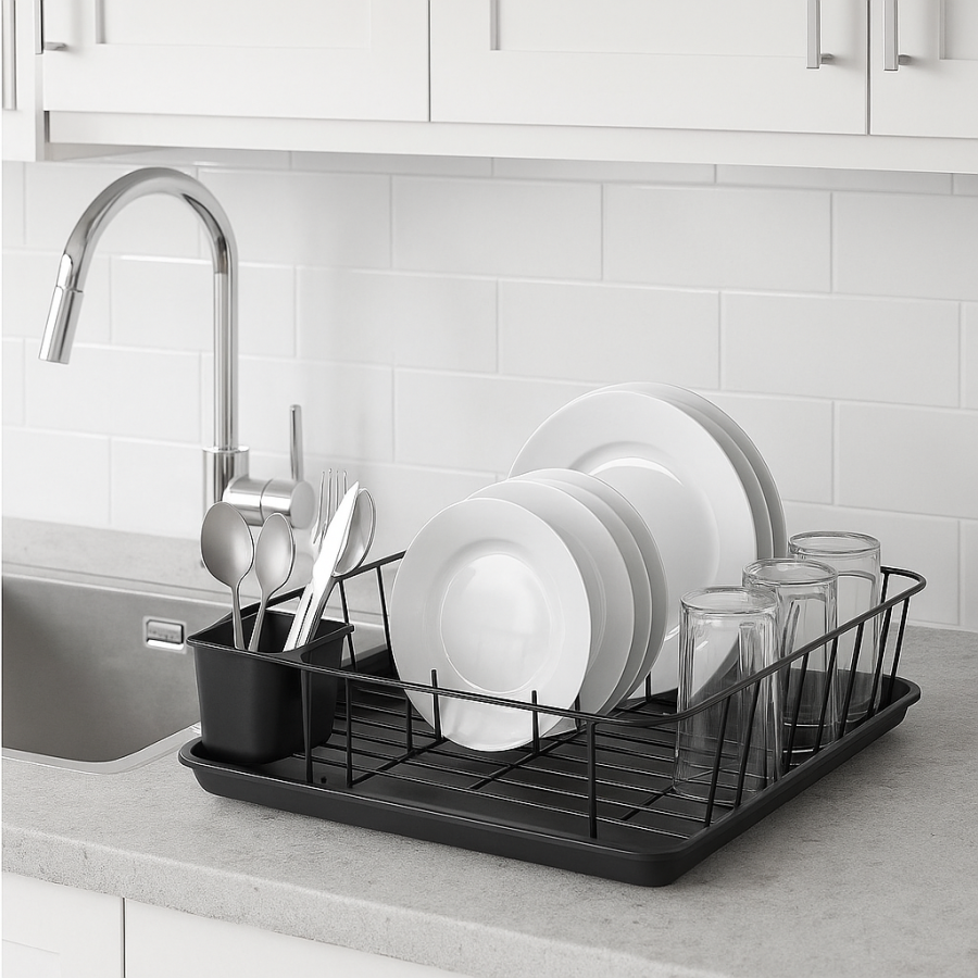 Escurridor de platos moderno y funcional, ideal para mantener tu cocina ordenada. Incluye bandeja recogegotas y porta cubiertos doble, fabricado en material resistente y fácil de limpiar.