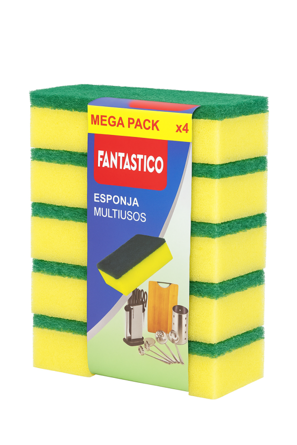 Set de 4 esponjas resistentes ideales para limpiar ollas, platos y superficies. Con doble capa (fibra verde y esponja amarilla) para máxima eficacia en la limpieza del hogar.