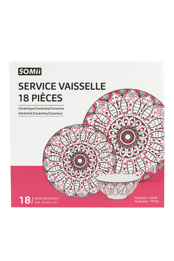 Elegante set de vajilla de cerámica de 18 piezas con diseño mandala en tonos rojo, blanco y negro. Ideal para darle un toque moderno y sofisticado a tu mesa. Incluye platos llanos, hondos y bowls.