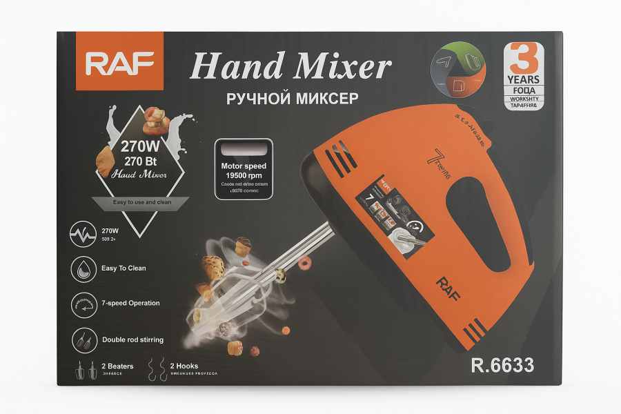 Batidora manual de 270W con 7 velocidades, ideal para mezclar, batir y amasar. Incluye 2 batidores y 2 ganchos, motor de 19.500 rpm y diseño ergonómico. Fácil de limpiar y con 3 años de garantía.