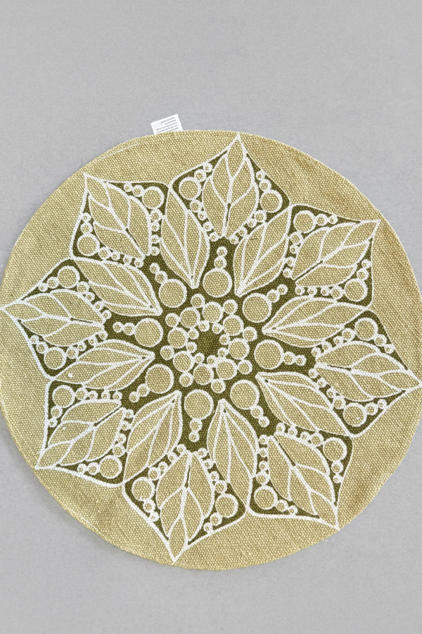 Alfombra redonda tejida con diseño mandala en relieve, ideal para darle un toque cálido y natural a cualquier espacio. Perfecta para mesas, recibidores o decoración del hogar