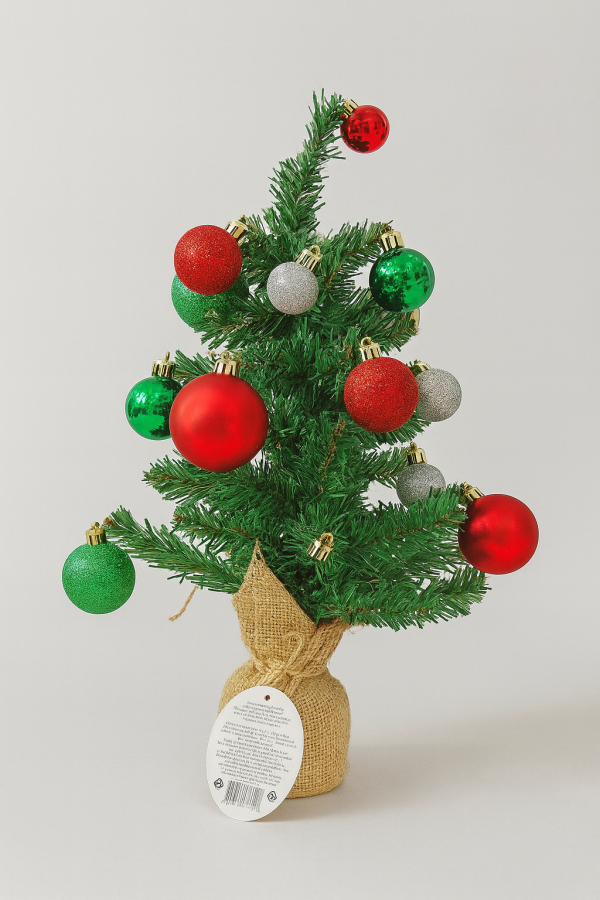 Arbolito navideño de 45 cm, ideal para mesas, escritorios o espacios pequeños. Base forrada en arpillera para un toque rústico y elegante. Listo para colocar y decorar cualquier ambiente