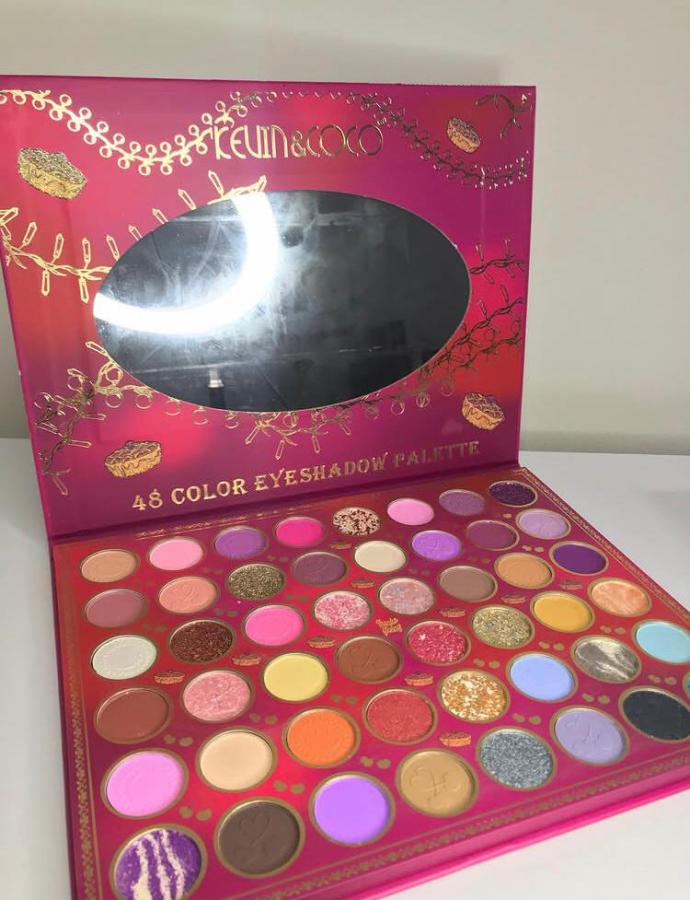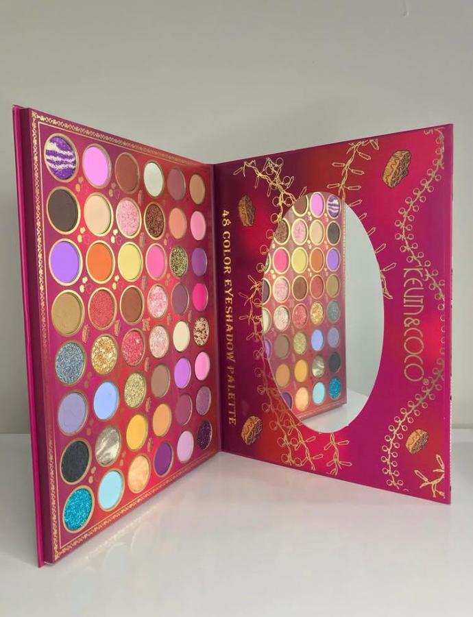 Esta paleta contiene 48 sombras en tonos mates, satinadas y glitter cremoso, altamente pigmentados y de alta fijación. Incluye un espejo para retoques.